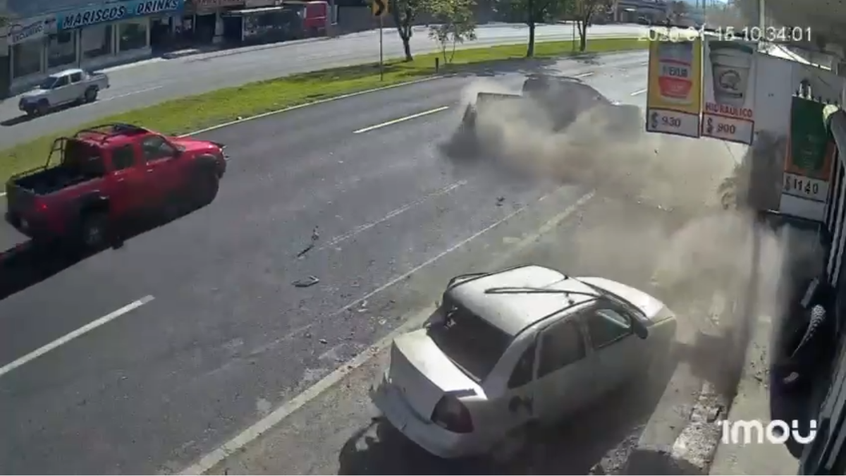 El hombre camina hacia el local, intercambia un saludo y entra al negocio. Apenas unos segundos después, la escena cambia por completo. Una camioneta aparece de manera repentina en el encuadre y se impacta violentamente contra los vehículos estacionados.